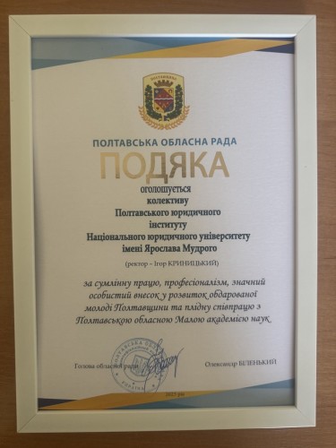 Подяками обласної ради відзначили колективи закладів вищої освіти Полтавщини за співпрацю з МАН. В тому числі Подяку Полтавської обласної ради отримав колектив Полтавського юридичного інституту Національного юридичного університету ім. Ярослава Мудрого.