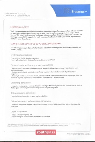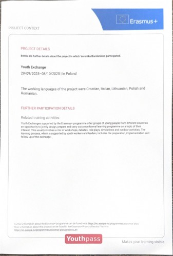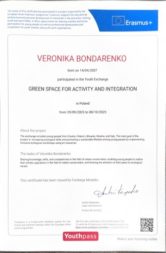 Студентка 2 курсу, 21 групи Полтавського юридичного інституту Національного юридичного університету імені Ярослава Мудрого Вероніка Бондаренко, взяла участь у короткотерміновому навчанні в межах міжнародного проєкту «Green Space for Activity and Interaction», що проходив у Польщі, у мальовничій місцевості Гута Полянська.