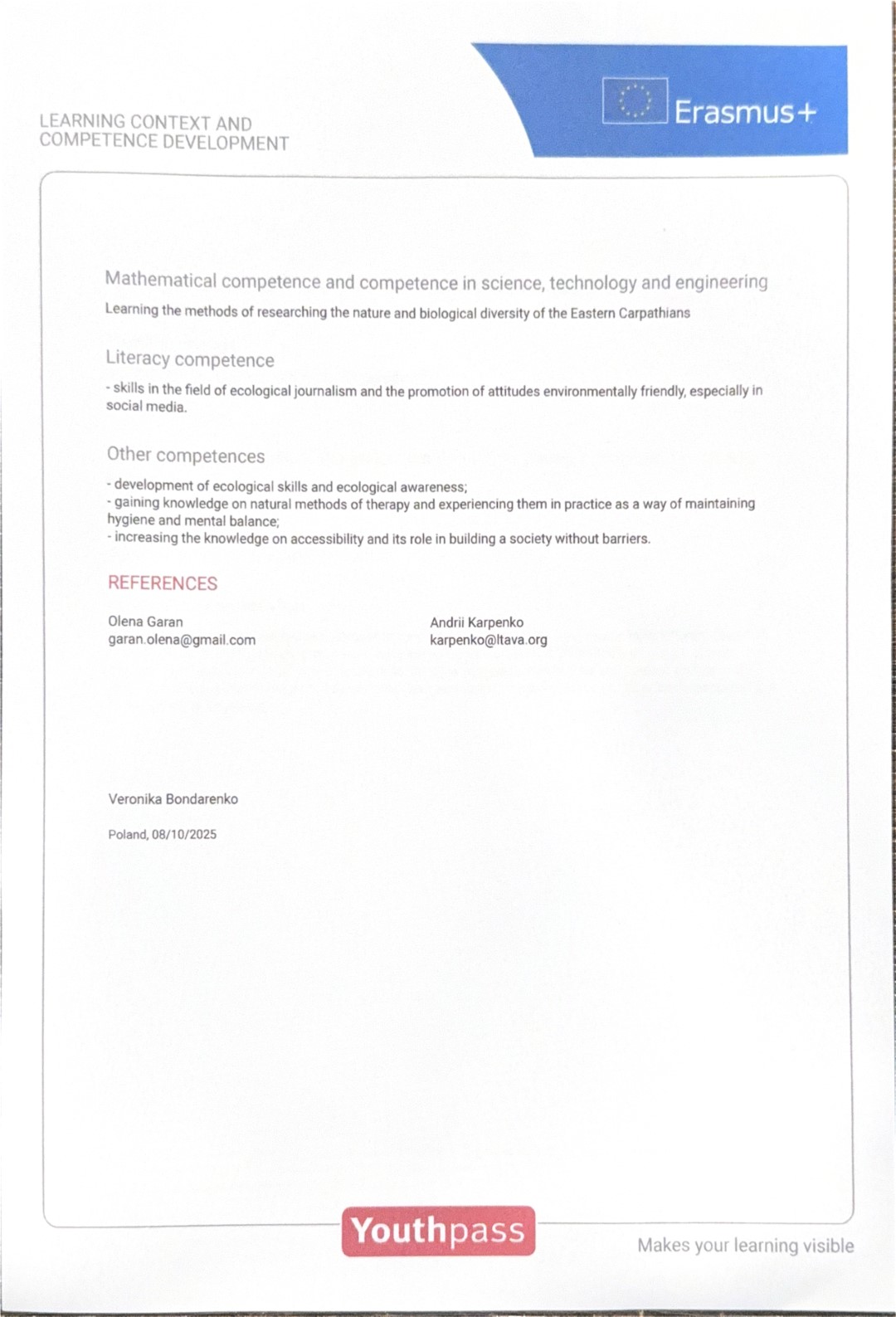 Вероніка вважає: «Участь у програмі стала для мене цінним досвідом міжнародної співпраці, допомогла вдосконалити знання англійської мови, комунікативні та організаційні навички». Отримані знання та досвід вона планує використовувати у подальшому навчанні та громадській діяльності, сприяючи розвитку екологічної культури серед студентської молоді.