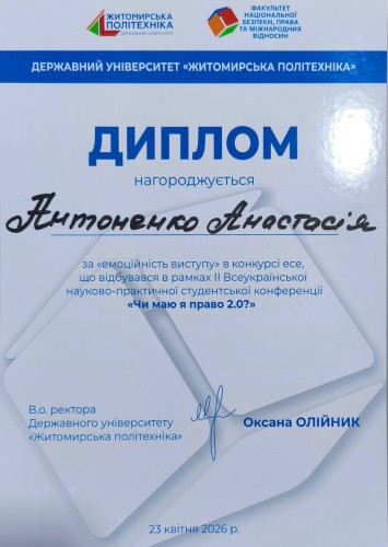 За результатами конкурсу есе Анастасія Антоненко увійшла до фіналу та була відзначена дипломом за емоційність виступу.