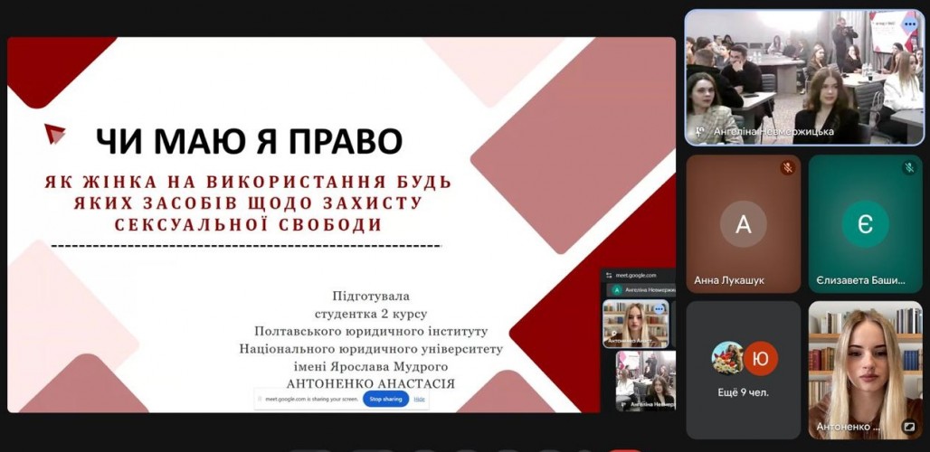 У межах заходу Анастасія Антоненко, студентка 2 курсу ПЮІ, під керівництвом доцентки Тетяни Михайліченко, виступила з доповіддю на тему «Чи маю я право, як жінка, на використання будь-яких засобів для захисту сексуальної свободи?». Тематика виступу викликала жвавий інтерес та позитивний відгук аудиторії.